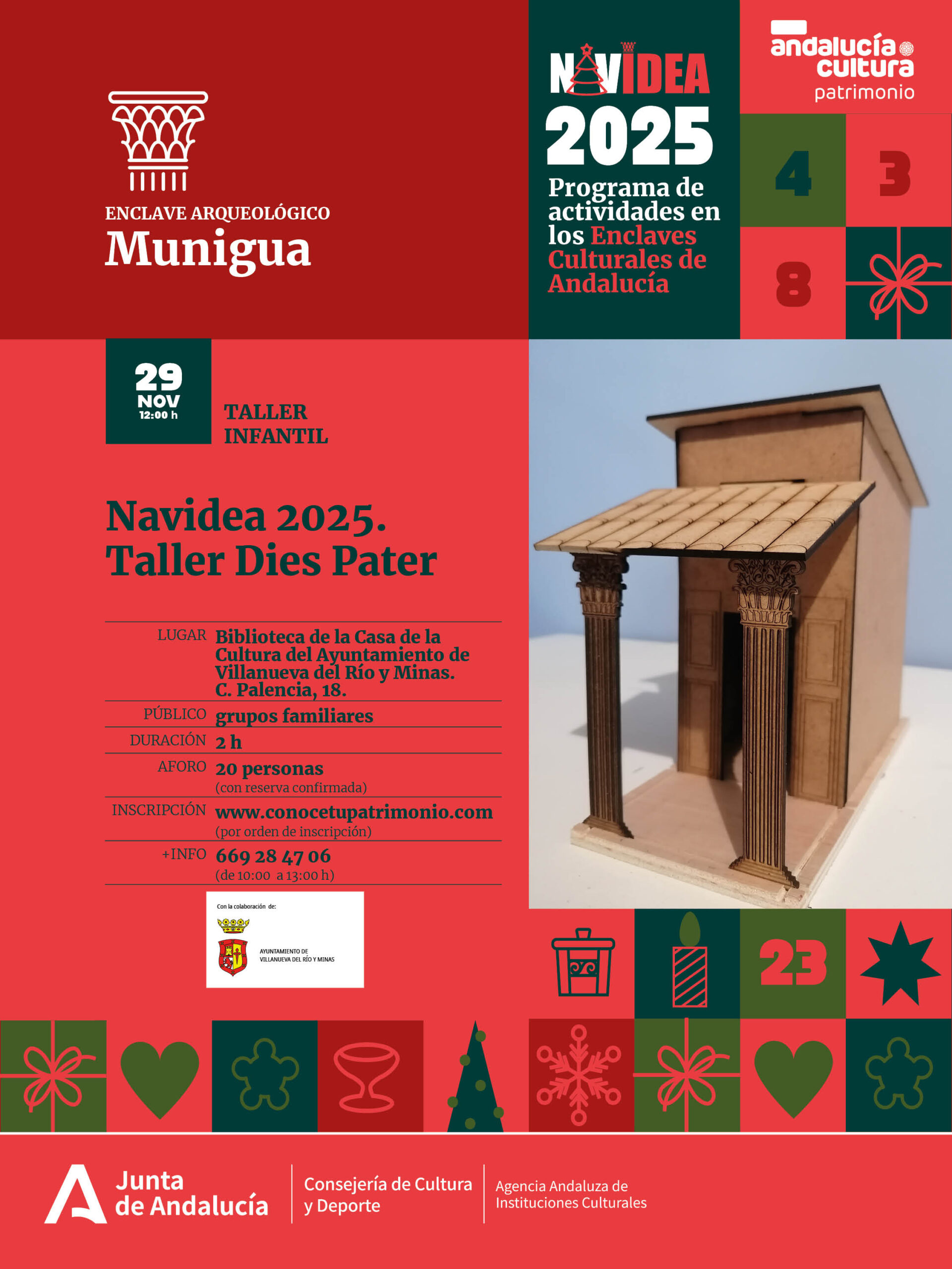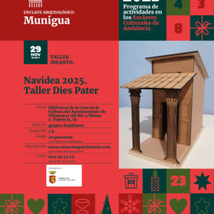 Taller Infantil que consiste en el montaje y decoración de una maqueta del Santuario Dies Pater del Enclave Arqueológico de Munigua El santuario de DIS PATER en Munigua, está situado en el ala norte del foro, junto a la curia y el tabularium. Se trata de un recinto de dimensiones reducidas, una cella o pequeña estancia rectangular embebida en el frente porticado del foro. La identificación como templo está asociada a la divinidad romana del inframundo y de las riquezas subterráneas. La actividad consistirá en el montaje de una maqueta del templo compuesta por piezas de madera ya cortadas a láser y posteriormente su decoración con pinturas acrílicas. El santuario de DIS PATER en Munigua, está situado en el ala norte del foro, junto a la curia y el tabularium. Se trata de un recinto de dimensiones reducidas, una cella o pequeña estancia rectangular embebida en el frente porticado del foro. IMPORTANTE : Los menores tienen que estar siempre acompañados por adultos y bajo su responsabilidad. ...